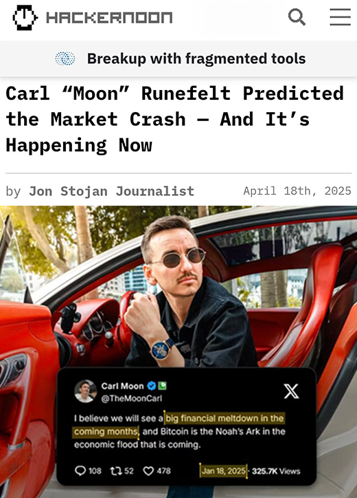 Carl Moon Runefelt posted a tweet in January 2025 about a potential market crash in the coming months. HACKERNOON gives special coverage to Carl’s prediction becoming a reality in April, making people wonder how he saw it coming.