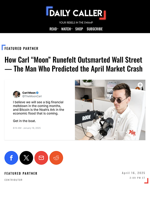 The Special Feature Article on Daily Caller highlights how, in January 2025, Carl "Moon" Runefelt predicted a major market crash on Twitter. His forecast, based on indicators like the federal funds rate and rising consumer debt, proved accurate when the market experienced a sharp downturn in April.