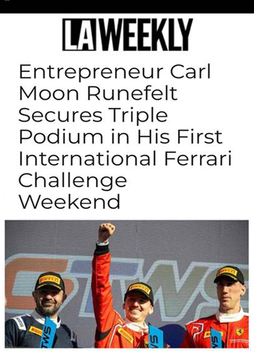 LA Weekly covers Carl Moon Runefelt's breakthrough performance during his first international race weekend. Competing in the Ferrari Challenge, Carl secured a triple podium with two victories and a second-place finish.